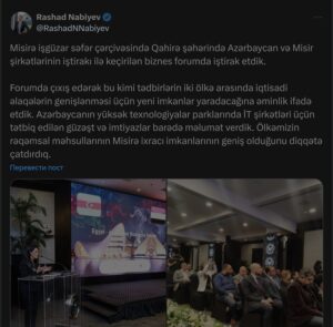 “Forumda çıxış edərək bu kimi tədbirlərin iki ölkə arasında iqtisadi əlaqələrin genişlənməsi üçün yeni imkanlar yaradacağına əminlik ifadə etdik. Azərbaycanın yüksək texnologiyalar parklarında İT şirkətləri üçün tətbiq edilən güzəşt və imtiyazlar barədə məlumat verdik. Ölkəmizin rəqəmsal məhsullarının Misirə ixracı imkanlarının geniş olduğunu diqqətə çatdırdıq”, – R.Nəbiyev vurğulayıb.