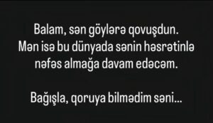 Paraqraf.com xəbər verir ki, “İnstagram” hesabında etdiyi paylaşımda üzüntüsünü ifadə edib: “Balam, sən göylərə qovuşdun. Mən isə bu dünyada sənin həsrətinlə nəfəs almağa davam edəcəm. Bağışla, qoruya bilmədim səni… Nur içində yat, Arzum”.