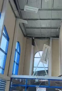 Paraqraf.com xəbər verir ki, dron hücumundan sonra binanın tavan hissəsi demək olar tamamilə dağılıb.